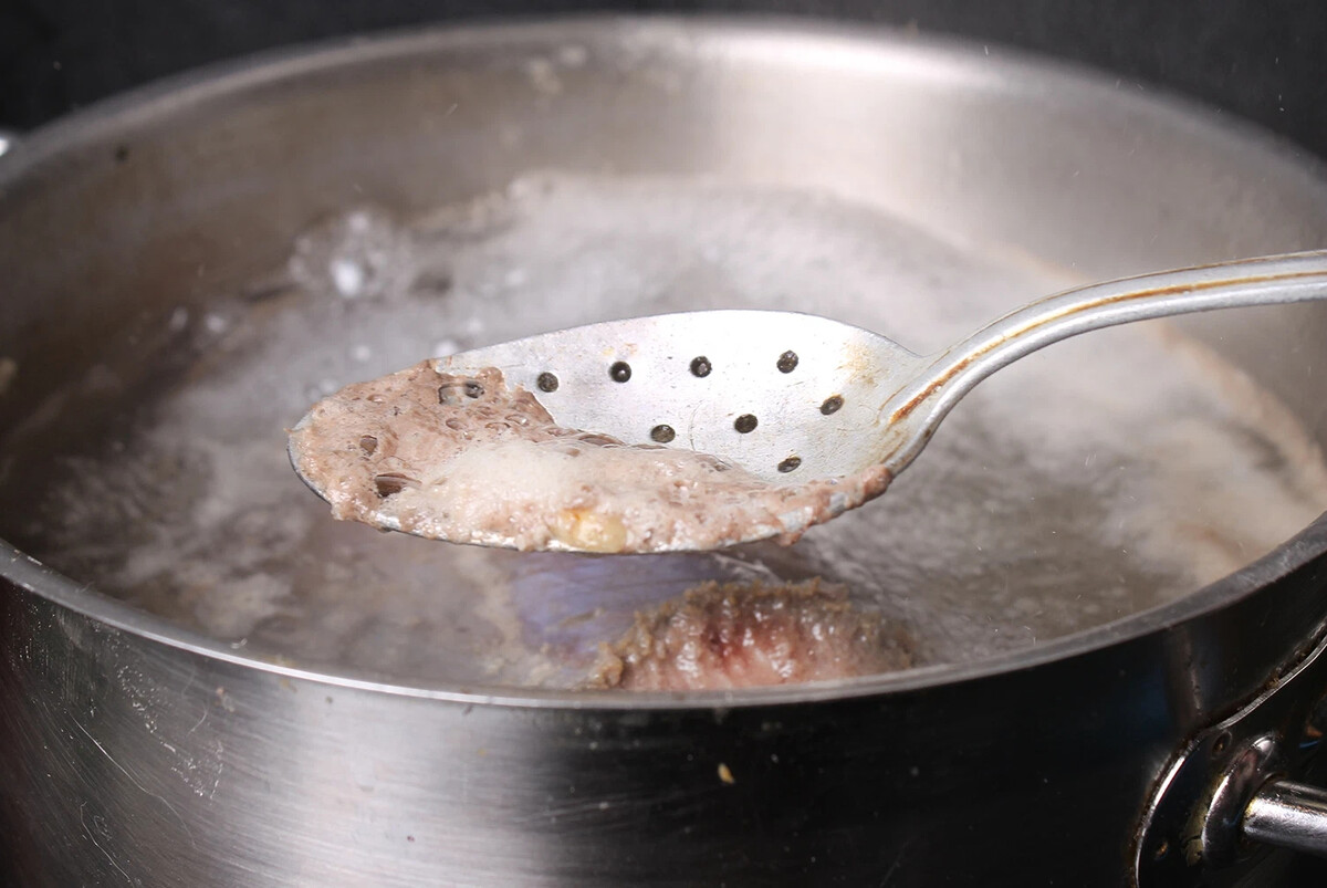 Обычно мы заливаем мясо холодной водой и, дожидаясь закипания, тут же начинаем снимать пенку. Пенка на поверхности бульона есть ни что иное, как свернувшийся белок.