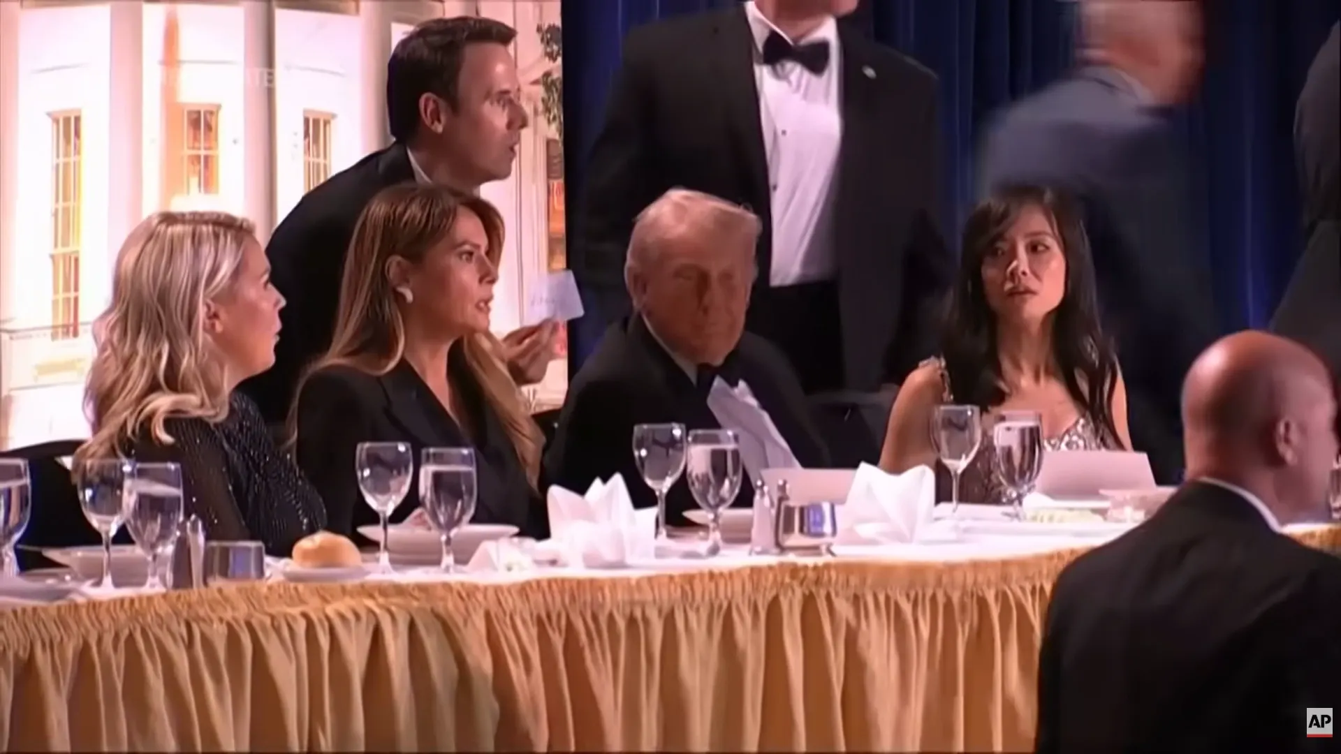 На видео длинный стол, установленный на сцене перед большим залом, где, собственно, шло мероприятие. За столом – самые высокопоставленные гости, включая Трампа и Вэнса. В момент, когда раздаются звуки стрельбы, Трамп остаётся сидеть, но многие, в том числе Джей Ди, начинают прятаться под столом. На сцену вбегает разномастная охрана, судя по всему, из разных спецслужб и начинает выводить людей, прикрывая своими телами.